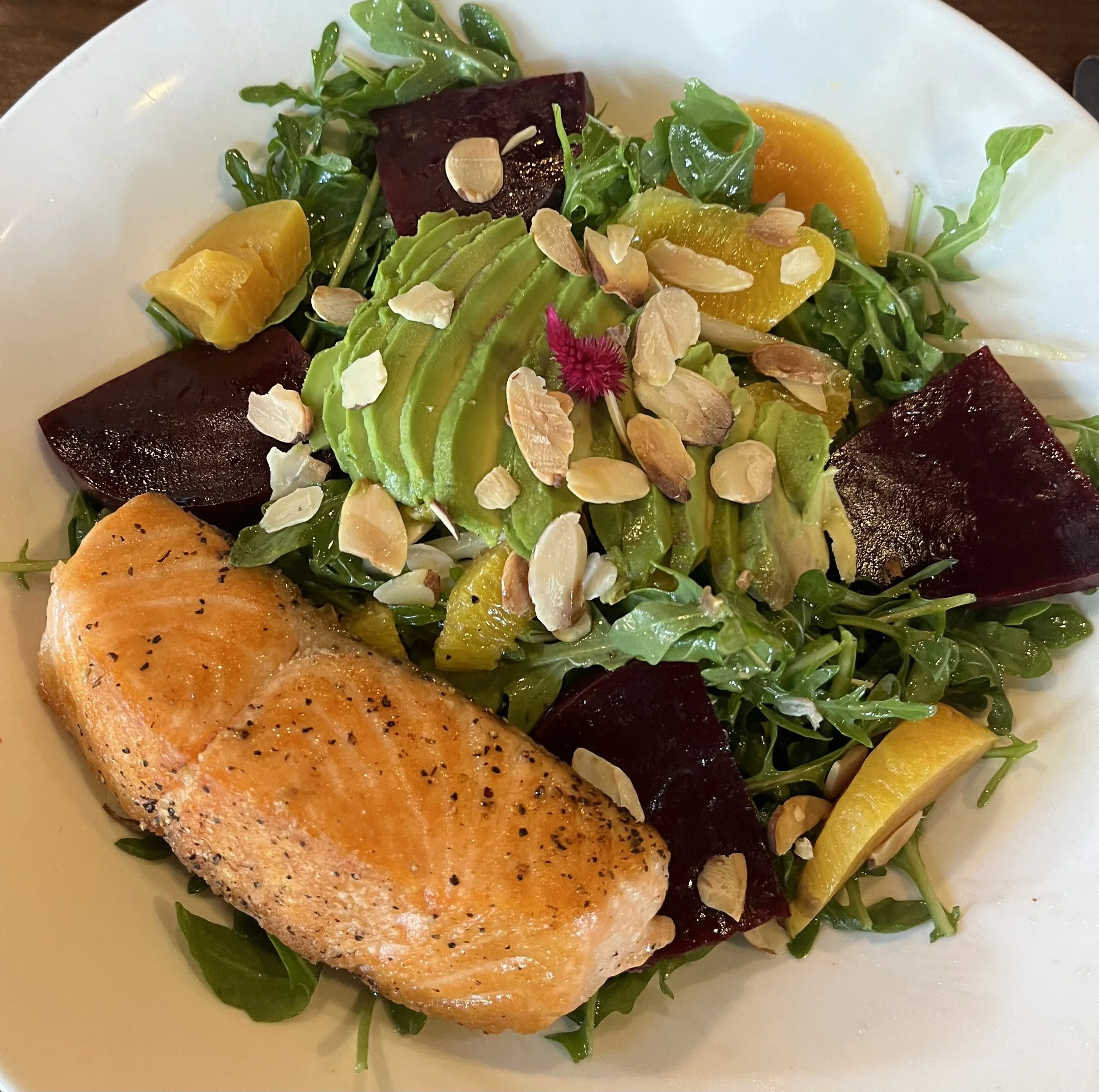Layer the good stuff – Place the warm (or chilled) salmon fillet in the center, tuck the avocado slices alongside, and sprinkle shaved almonds over the top.