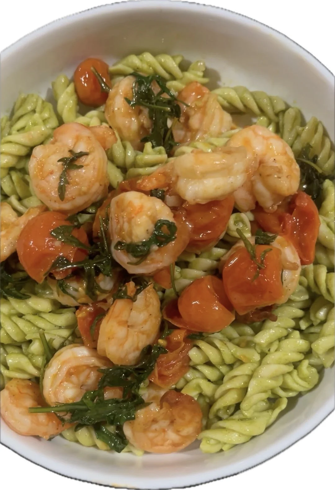 Toss in the shrimp, cherry tomatoes, and arugula.